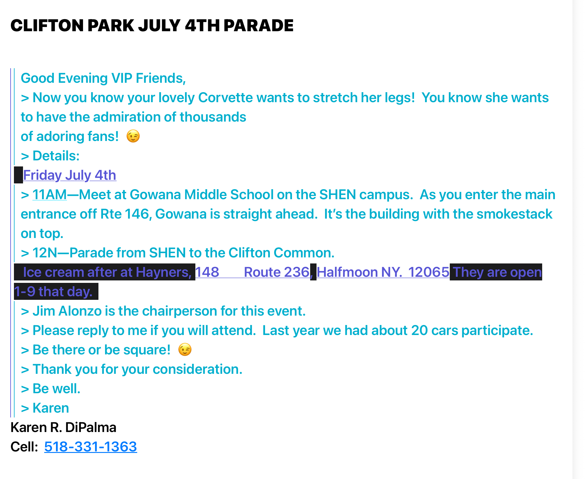 « All Events This event has passed. July 4th Parade In Clifton Park – meet at Gowana Middle School on Shen campus @ 11 July 4, 2025 @ 11:00 am - 1:00 pm « Ice Cream Night – The Control Tower Latham 6PM Sturbridge Village Ride » Add to calendar Google Calendar iCalendar Outlook 365 Outlook Live Details Date: July 4, 2025 Time: 11:00 am - 1:00 pm Organizer Jim Alonzo Phone 5188557037 Email jalonzo@nycap.rr.com